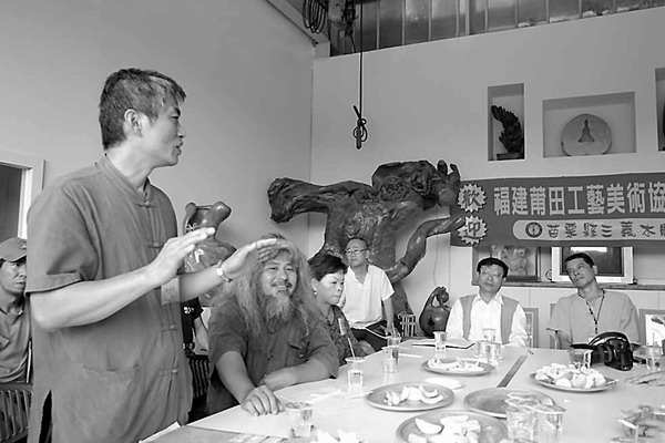 圖為臺灣木雕家徐士珩先生為莆田市工藝美術參訪團介紹三義木雕發(fā)展情況。(李宇光 攝)