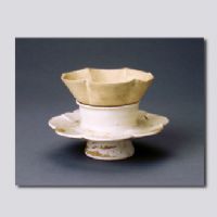 首都博物館藏。盞呈六瓣蓮花形。敞口,淺斜腹,圈足。通體施白釉,釉下有白色化妝土,外壁施釉不到底,足脊有支燒痕。托由托杯及托盤相連而成,撇口,直壁,仰蓮式托盤。托口高于托盤。高圈足外撇。通體施白釉。