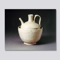 首都博物館藏。注壺和溫碗組成一套溫酒器。注壺口沿微侈,折肩,圓腹,脛內(nèi)收,圈足外撇。一側(cè)頸肩之間連以帶狀曲柄,另一側(cè)肩部置管狀流。通體施白釉,釉下施白色化妝土,足內(nèi)無釉有支燒痕,腹部刻折枝花,花紋淳樸自然。釉色白中泛黃,施釉較厚,釉面瑩亮,釉下有明顯的旋坯紋。溫碗敞口,深腹,圈足。通體施白釉,釉下有白色化妝土,外壁施釉不到底,內(nèi)心有四條支燒痕。外壁刻折枝花。胎質(zhì)略粗,胎體堅實。注壺和溫碗為宋遼金時期流行的一套溫酒器,與盞托、盞盤配套使用。