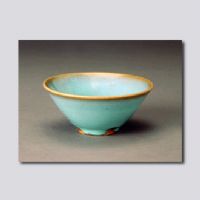 首都博物館藏。敞口,斜直壁,圈足,足脊無釉。通體施天藍色釉,口沿處釉垂流露出胎色。釉層凝厚有氣泡,色調(diào)幽雅。