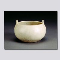 首都博物館藏。斂口,鼓腹,平底,口沿有對稱雙系。在系與罐體連接處有數(shù)十個(gè)乳釘紋裝飾,有模仿金屬工藝的效果。內(nèi)外施白釉,外壁施釉不到底。釉層凝厚,腹部有縮釉現(xiàn)象,積釉處泛青色。