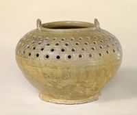 罐直口,鼓腹,足外撇。口兩端貼半環(huán)形繩系。通體施青釉,腹上部滿飾鏤孔。南方的青瓷制作水平到西晉時有了很大提高,掌握了還原焰的燒制技術(shù),青釉色彩較穩(wěn)定,胎質(zhì)細膩,胎色灰白。除印貼、鏤孔等裝飾手法外,西晉的壺、罐、尊、洗類器物的肩部和口沿多飾裝飾帶,以細密的幾何圖案為主。此器釉厚處色調(diào)較深,釉薄處則淺淡,整體效果晶瑩明澈。