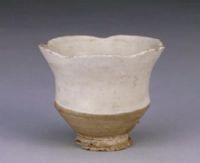 杯口呈葵瓣式,口下漸收,圈足。器里外均施白釉,外壁施釉不到底,近底處露胎。葵瓣口樣式的瓷器來(lái)源于同時(shí)期的金銀器,因制瓷工藝的改進(jìn)提高,使瓷質(zhì)實(shí)用器的品種得以豐富,生產(chǎn)數(shù)量加大并部分替代了金、銀器具,此杯的造型即模仿金銀器而來(lái)。