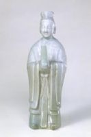 壺體造型為一男子,束冠,著長(zhǎng)襟衣衫,雙腿直立,微露雙足。人軀體中空,頭有孔為壺口,雙手于胸前捧方口壺流,后背中央附曲柄。人物面部表情莊重肅穆。通體施青釉,釉色青綠,勻凈滋潤(rùn),因衣紋線條折角處釉薄呈現(xiàn)出胎色而具有立體效果。