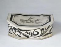 宋、金、元時(shí)期瓷枕品種多樣,形式紛繁,主要用作寢具,同時(shí)也用以隨葬。其中磁州窯瓷枕最具代表性,枕的造型各式各樣, 品種繁多,紋飾內(nèi)容多取材于民間生活,裝飾手法采用繪、刻、印、劃、剔、鏤等,特別是白地繪黑彩,運(yùn)用豪放的筆法,嫻熟的技巧,在不到半尺的枕面上揮灑自如,將繪畫(huà)藝術(shù)巧妙地運(yùn)用到瓷枕裝飾上,具有濃厚的水墨畫(huà)風(fēng)格。此枕色彩黑白分明,對(duì)比強(qiáng)烈,寥寥數(shù)筆,把馬戲表演中的精彩瞬間表現(xiàn)得淋漓盡致,富有濃郁的民間生活氣息。