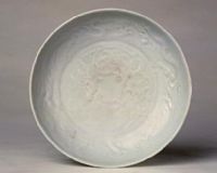 盤直口,淺弧壁,圈足。胎體堅(jiān)致潔白,里外施白釉。盤心及內(nèi)壁模印云龍紋。