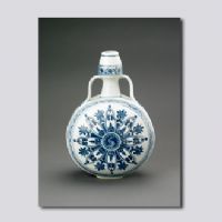 此瓶仿西亞地區(qū)阿拉伯金屬器造型及紋樣,其腹部輪花紋是阿拉伯地區(qū)特有的紋飾。景德鎮(zhèn)御窯廠同時燒造的仿阿拉伯地區(qū)器形還有花澆、水注、大盤、大扁壺、折沿盆等,反映了明朝與西亞地區(qū)的文化交流。