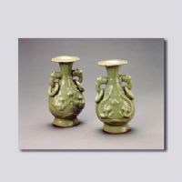 首都博物館藏。喇叭口,長頸,溜肩,垂腹,圈足。頸肩和腹部飾有弦紋,頸部兩側(cè)各有一獸耳銜環(huán)。腹部凸雕雙龍及雙鳳紋。釉色淡青,釉層厚潤。器物造型淳樸,胎體厚重。龍泉窯始燒于北宋前期,南宋極盛,明中后期漸衰。