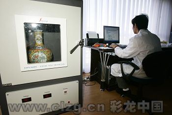 這臺儀器大約有半人高。工作人員首先為待檢的瓷器用酒精進(jìn)行消毒,之后放入儀器真空艙內(nèi),用橡膠泥把瓷器固定住,把大約1平方厘米大小的受檢測面對準(zhǔn)探測器。之后,工作人員關(guān)上艙門用電腦操作起來。真空艙開始抽氣,接著是150秒的探測時間,如此進(jìn)行兩次以求精確。接下來,電腦把所得數(shù)據(jù)與數(shù)據(jù)庫中的數(shù)據(jù)進(jìn)行比對,15分鐘后得出結(jié)論,所有元素符合標(biāo)準(zhǔn)。除少量污染外,不含任何現(xiàn)代元素——這是一尊真正的南宋龍泉窯粉青釉瓷器。
