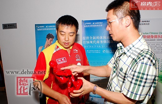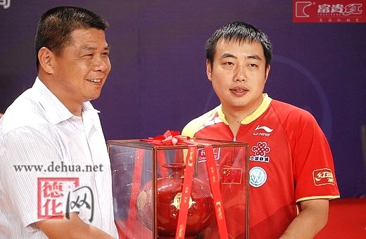 賽前,廈門(mén)市湖里區(qū)區(qū)委書(shū)記李棟梁與國(guó)乒隊(duì)互贈(zèng)紀(jì)念品,著名運(yùn)動(dòng)員、國(guó)家男乒主教練劉國(guó)梁代表國(guó)乒隊(duì)接過(guò)了中國(guó)瓷都·德化富貴紅“天地五福”瓷瓶。富貴紅文化發(fā)展有限公司藝術(shù)總監(jiān)徐少東還向國(guó)家男乒贈(zèng)送了富貴紅瓷雕“拼搏”以及“賞瓶”并預(yù)祝國(guó)乒隊(duì)在奧運(yùn)會(huì)上獲得好成績(jī),爭(zhēng)取包攬金牌。