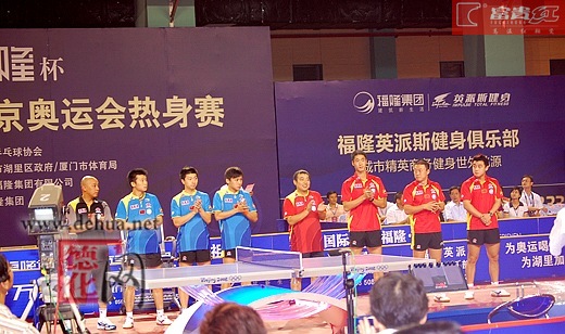 7月12日,正在廈門(mén)進(jìn)行封閉訓(xùn)練的國(guó)家乒乓球男隊(duì)在廈門(mén)湖里區(qū)中國(guó)乒乓球訓(xùn)練基地舉行“福隆杯”中國(guó)乒乓球隊(duì)北京奧運(yùn)會(huì)熱身賽。國(guó)家男乒即將參加奧運(yùn)會(huì)的主力隊(duì)員王皓、王勵(lì)勤和馬琳(2008奧運(yùn)隊(duì)),替補(bǔ)隊(duì)員陳玘、馬龍和張超(2012奧運(yùn)隊(duì))等優(yōu)秀選手登場(chǎng)亮相。