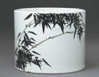 清康熙朝官窯瓷器的裝飾畫(huà)面有許多出自當(dāng)時(shí)名畫(huà)師的手筆。此筆筒所繪的簇簇墨竹清秀挺拔,瘦勁有力,深淺相宜,富于層次感,有如畫(huà)在白紙上的國(guó)畫(huà)一般生動(dòng)細(xì)膩,絕非一般工匠所能為。加之墨彩黑亮如漆,光滑濃艷,與純白的底釉構(gòu)成強(qiáng)烈的色彩對(duì)比,賦予此筆筒不同凡俗的審美意趣。此墨彩筆筒將詩(shī)、書(shū)、畫(huà)、印結(jié)合于一體,為康熙朝五彩瓷文具中的精品。