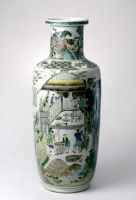 瓶洗口,直頸,折肩,直腹,圈足,形似搗衣用的木棒槌,故俗稱“棒槌瓶”。瓶身彩繪4組紋飾?诓恳跃G彩墨線勾畫回紋一周。頸部繪通景山水人物紋。肩部繪梅花錦紋及4個(gè)開光,開光內(nèi)繪琴棋書畫。瓶身以五彩繪養(yǎng)蠶、碓米2組主題紋飾,每組繪6人于室外勞作,并題“舂碓”、“分箔”及五言詩2首。