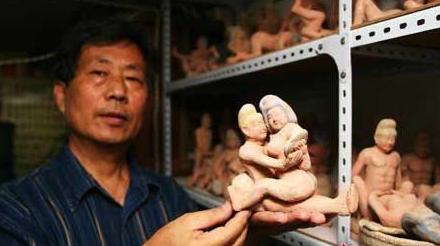 其中,被成為“性愛陶娃”的這百余件中國(guó)性文化彩陶占據(jù)了滿滿一面墻。陳列架上擺設(shè)的小陶娃,都是普通人看了會(huì)臉熱心跳,不敢正視的古代性愛造型。包括各種形態(tài)、各種姿勢(shì),男女人物共有200多個(gè),高達(dá)20厘米以上,人物神態(tài)豐富,栩栩如生。