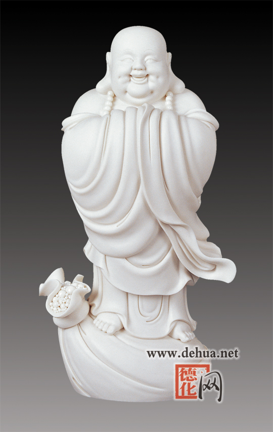 賞析:作者以德化傳統(tǒng)人物雕塑工藝,將立于布袋之上的彌勒笑容可掬的形態(tài)表現(xiàn)的惟妙惟肖。其工藝精湛,其外形如脂如玉。