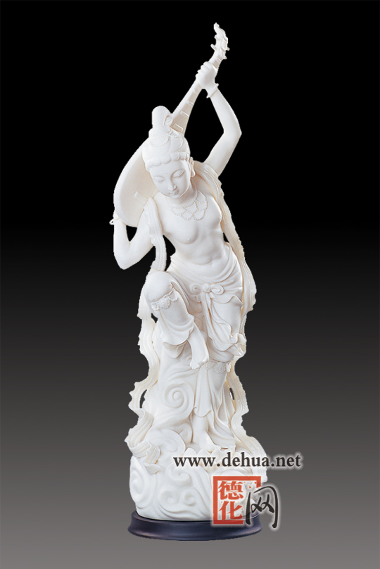 賞析:作品取材于敦煌壁畫伎樂(lè)飛天,結(jié)合德化傳統(tǒng)人物瓷塑技法,使其人物神態(tài)逼真。組雕寓意太平盛世,歌舞升平。
