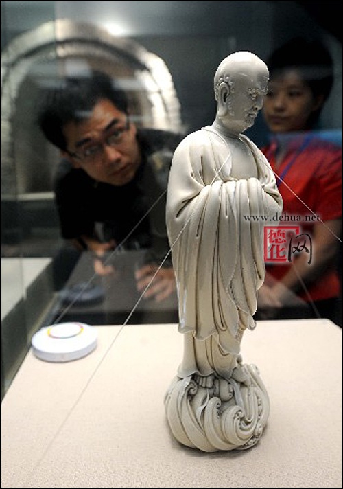 新華社照片,北京,2008年7月28日觀眾在參觀德化窯“何朝宗”款達(dá)摩瓷塑立像