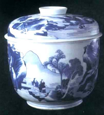 康熙青花山水人物紋蓋罐