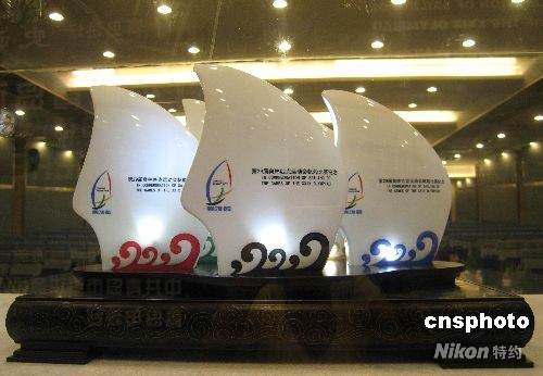 為慶賀并銘記二00八北京奧運(yùn)會暨青島奧帆賽,以體現(xiàn)“奧運(yùn)揚(yáng)帆、五洲傳情”為主題的第二十九屆奧林匹克運(yùn)動會帆船比賽紀(jì)念收藏品骨質(zhì)瓷“揚(yáng)帆情”,七月二十八日在青島國際新聞中心舉行首發(fā)式。圖為其展示品。