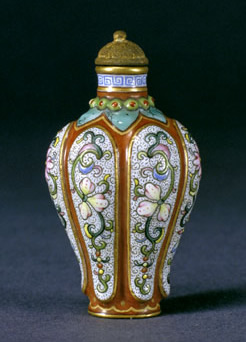 煙壺呈瓜棱形,細(xì)頸,銅鍍金鏨花蓋,下連銅鍍金勺。頸部繪藍(lán)彩回紋,頸、肩相接處飾串珠紋一周,下繪變形蓮瓣紋。肩、腹部呈六瓣瓜棱狀。瓜棱上軋粉彩折枝花卉,色彩淡雅,花紋精細(xì)。瓜棱間隙處為珊瑚紅地,上下以金彩點(diǎn)綴,襯托出煙壺的富麗華貴。足內(nèi)紅彩篆書“乾隆年制”四字款。