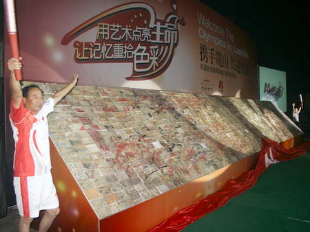 孫莉介紹說,2008塊瓷板就是2008份對奧運的祝福,這些瓷板通過拼裝組合后由成都本土藝術(shù)家完成后期加工創(chuàng)作并整體上釉,最終制成了這件永久留存的藝術(shù)品。當天晚上,兩位奧運火炬手與來自災區(qū)的孩子及成都藝術(shù)家一起為奧運瓷板墻拼上了最后八塊瓷畫,從而完成了這件具有特殊意義的奧運祝福瓷板墻。