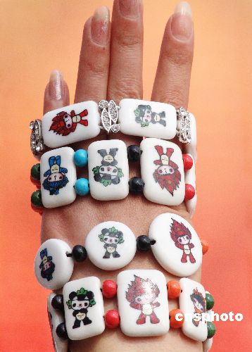 在江西省景德鎮(zhèn)營業(yè)員展示奧運(yùn)福娃瓷手鏈。