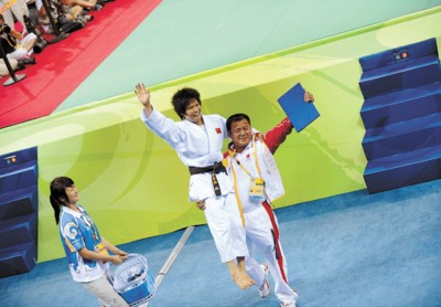 當(dāng)計(jì)時(shí)的秒表指向“零”時(shí),在場(chǎng)下緊張觀戰(zhàn)的冼東妹教練興奮地?fù)]舞著雙拳大聲叫喊,而當(dāng)冼東妹走下場(chǎng)時(shí),教練高興地將她扛起走了幾步。剛剛放下,教練發(fā)現(xiàn)不少攝影記者都在為這位冠軍拍照時(shí),又再度將弟子扛起,而“媽媽冠軍”則在教練寬厚的臂膀上輕輕向眾人揮手致意,臉上露出幸福的微笑。