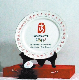 昨天中午記者來到市民孫云中家中時,首先映入眼簾的便是擺放在客廳茶幾上、用紅木托架起的這枚白色瓷碟。記者看到,直徑30厘米大的白色瓷碟上刻滿了北京奧運會的代表標志。瓷碟正面不到4厘米的外沿上,精細地刻著35個紅色的奧運項目標志圖。翻過瓷碟,其背面更是精彩,瓷碟背面用優(yōu)雅的美術字刻著“北京歡迎你”及五個活靈活現(xiàn)的奧運福娃形象,在五個福娃的身上,分別有五個不同字體的“福”字。