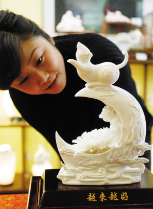 一名顧客在觀賞用白瓷燒制的鼠年吉祥物“越來越好”。當日,“德化窯精品瓷器展”島城亮相,近百件來自福建德化窯的“中國白”與“鼎晟紅”瓷器在閩江路錢匯工藝品廳開始展出。記者看到,這尊《越來越好》的白瓷工藝品,設(shè)計者把一只可愛的小老鼠(俗稱:耗子)放置在一輪彎彎的月亮上,預(yù)示著我們的生活“越來越好”。據(jù)該店經(jīng)理牟女士介紹,福建省德化縣是中國的三大古瓷都之一,古代以燒制“中國白”而聞名中外,新近出水的南海一號宋代沉船上,就發(fā)掘出不少出自該縣的“中國白”工藝品。“中國白”不僅具有收藏價值,而且是收藏品中的珍品。它既能給居家增添文化氛圍和美的享受,又能給人們帶來增值效應(yīng),因此,歷來備受人們的青睞。