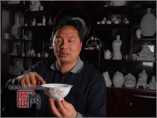 筆者看到鄧明龍,一手托住一只口徑10厘米畫有中國(guó)花鳥圖案的白瓷碗底,另一手往碗里倒溫水,然后在碗口沾點(diǎn)水,手指在上面輕輕滑動(dòng),手指在碗上的轉(zhuǎn)速不同,就能發(fā)出不同節(jié)奏的聲響,宛如瓷碗外觀的鳥鳴不已。一次偶然的機(jī)會(huì),鄧明龍得知德化有—位畢業(yè)于江西景德鎮(zhèn),人稱“德化鐵線條”畫得一手好工筆的玫瑰老藝人,于是,他虛心請(qǐng)教,終于使得“會(huì)唱歌”的茶碗配上她一氣呵成的雙鳥鳴叫工筆畫。由此,具有德化風(fēng)格的茶碗又多了一個(gè)傳統(tǒng)文化的音符。
