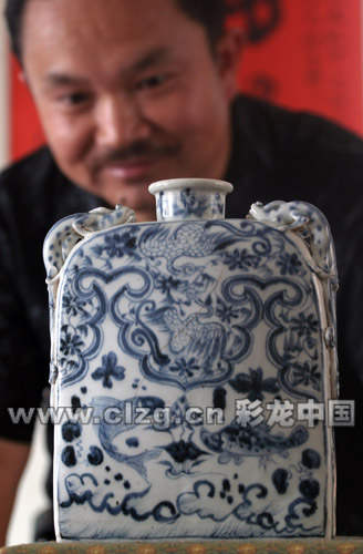 一騎戰(zhàn)馬馳騁在廣闊的草原上,一個大漢瀟灑地從馬背上的皮囊中拿出一個扁壺,豪邁暢飲……24日看到這個式樣獨特的元青花“四系扁壺”時,一段珍藏的歷史就這樣自然地呈現(xiàn)出來。“四系扁壺”是云南省首件通過科學(xué)鑒定確認的元青花,它是古人放在馬背上裝水、裝酒的特殊器物,而這個扁壺背后還背負著收藏界一個爭論不休的謎題。