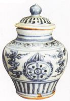 青花藍(lán)中泛灰,為國產(chǎn)“平等青”所致。繪書簡潔淡雅為成化風(fēng)格,在罐類中少見。出土?xí)r有明成化三年(1467年)紀(jì)年。此罐以法輪為主題,應(yīng)屬佛教用盛聹器。