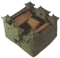 泥質(zhì)陶。城堡呈立方體形狀,四周築有高牆,牆上鏤孔棱格式窗。上有四阿頂式門樓,四周設(shè)角鏤。前後大門各有文吏和一武士守衛(wèi)。城堡內(nèi)有長(zhǎng)方形房屋兩幢,其中一是二層閣樓,設(shè)有樓梯,左側(cè)有一廁所。屋內(nèi)塑有數(shù)人,有的端坐,有的為跪姿,刻劃精細(xì),神態(tài)各異。