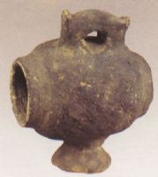 泥質(zhì)灰陶,胎質(zhì)堅(jiān)硬。鼓腹中空,兩端開口可以蒙皮。鼓上設(shè)一提梁,腹下置喇叭狀圈足。通體光素?zé)o紋。