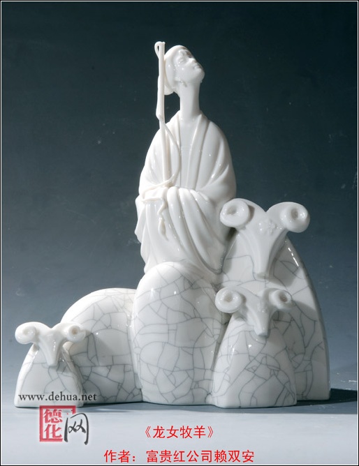 在《龍女牧羊》中,看不見龍女在冰天雪地里孤獨(dú)哀怨的情景,龍女身上舒緩、疏密有致的衣褶,線面流暢,富有韻律感,隱約著某種執(zhí)著、堅(jiān)定的守望。龍女膝下有三只羔羊乖巧地脆擁在龍女的身邊,與瑩瑩的材質(zhì)和斷斷續(xù)續(xù)的裂紋釉面一同寫意成綿綿可親的氛圍,烘托龍女的幽幽情思。作品整體呈三角形構(gòu)圖,刻意給讀者制造出穩(wěn)定、可靠的視覺,可看出創(chuàng)作者明晰的主題態(tài)度:對龍女內(nèi)心堅(jiān)強(qiáng)的贊美,贊美生命的可貴。