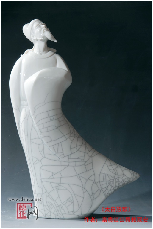 作品形體塊面間的柔和過渡,給人以圓潤、飽滿的形態(tài)生命感,張馳不一的裂紋釉表面肌理暗示著這種生命力的穿透和牽引。簡練概括的雕塑手法亦表達(dá)了作者面對精神偶像“詩仙”李白一種在情感選擇上純粹的崇敬。