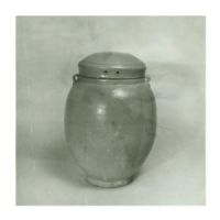 器身呈瓜棱狀,子母口,溜肩,圈足.肩部置二對(duì)稱泥條形系,器蓋面微鼓,中間作小平面,邊沿有二小孔,為穿繩系鈕之用.