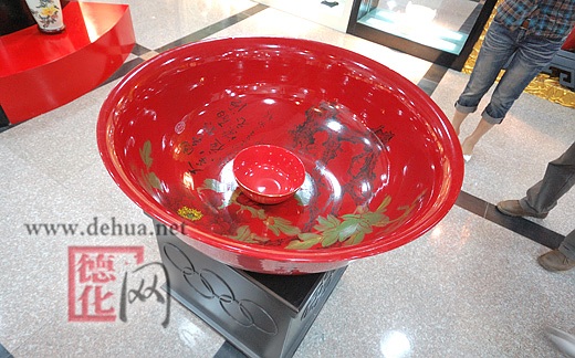 博餅是極富和諧熱鬧意味的一項民俗活動,為了更好地營造節(jié)日氛圍,福建冠,F(xiàn)代家用股份有限公司特地燒制這只《團圓和諧》博餅大碗。大碗通透溫潤,光可鑒月,雍容華貴,紅紅火火,喜氣逼人,工筆瓷繪纖毫畢現(xiàn),栩栩如生。它高37厘米,口徑99厘米,比德化陶瓷博物館收藏最大的碗直徑多50多厘米,比去年陳仁海燒制的“閩臺第一碗”直徑多40多厘米,是目前以德化瓷土制作的體積最大的碗,孩童甚至可在碗中游戲;吉祥的尺寸象征著祖國56個民族和睦相處,九九歸一。