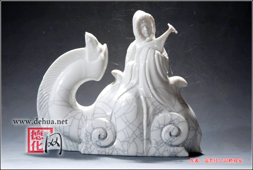 這僅僅只是一個(gè)平凡而美麗的古代女子。德化白瓷晶瑩剔透的材質(zhì),清麗、明朗,于人物是快樂和愉悅,是玉壁般的青春生命。造形形體間流動(dòng)旋轉(zhuǎn)的線,柔順和緩的面,舒展著人物形象含蓄、典雅的東方女性之美。人物座下的駱駝也被裝飾化了,情感化了,成了造形的有機(jī)部分,如同形成人物姿態(tài)的懷抱琵琶。裂紋釉的虛虛實(shí)實(shí)、忽走忽滯,這是創(chuàng)作者有意在表現(xiàn)工藝美感和淡化主題意圖,言外意境氣氛的營(yíng)造本是東方藝術(shù)的喜好。