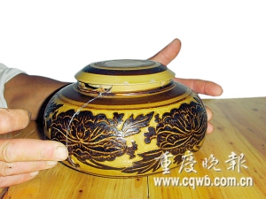50多歲的永川農(nóng)民劉遠(yuǎn)書偶然撿到寶貝:花幾十元錢買來的鄰家喂雞破罐,經(jīng)專家鑒定竟是距今約千年的稀世古瓷——“紫定黃地醬彩剔花蓋罐”。昨日,劉遠(yuǎn)書在親戚陪同下赴京尋買主。