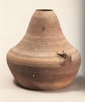 小斂口,斜肩,弧折腹,平底。頸、肩等處飾有水波紋、弦紋和錐點(diǎn)紋,肩部附牛形耳。匏壺是廣州地區(qū)漢代南越人的典型器物,在浙江尚屬首次發(fā)現(xiàn)。