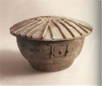 泥質(zhì)灰陶。囷身較矮,有一方形門(mén)。囷頂為斜坡形,上堆貼瓦楞,形制簡(jiǎn)樸。該器為隨葬品。