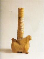 燭臺(tái)呈虎形,虎四肢伏地,昂首瞪眼,雙耳豎立,口略顯虎牙,尾巴上翹,表現(xiàn)出猛虎守衛(wèi)燭臺(tái)的姿態(tài)。燭管呈竹節(jié)形。整個(gè)燭臺(tái)給人以穩(wěn)重之感。此種虎形燭臺(tái),在兩晉時(shí)頗為少見,它不僅為了實(shí)用,更主要的是起到辟邪、鎮(zhèn)墓的作用。
