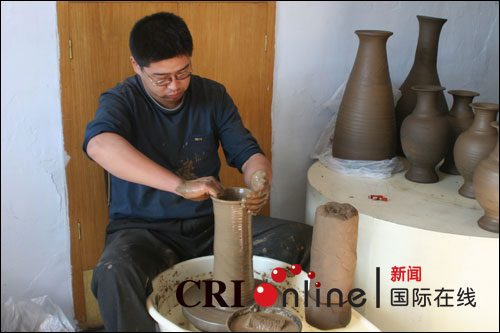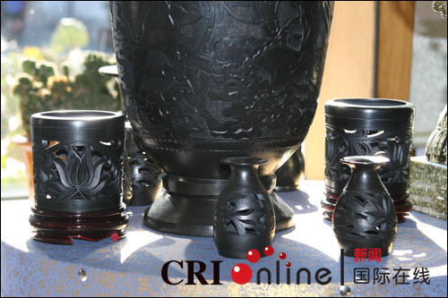在展廳里,各色陶器琳瑯滿目,其品種有瓶、著、缽、鼎、筒、爐、罐、文具等,造型美觀,古色吉香,漆黑光亮。走進(jìn)工作間,記者了解到黑陶的制作流程。勃利黑陶是利用東北黏質(zhì)土經(jīng)過濾、拉型、雕刻、壓光、燒制等現(xiàn)代工藝和傳統(tǒng)陶瓷工藝生產(chǎn)加工而成。據(jù)制作人員介紹,一件純手工黑陶制品要用三四天時間才能完成,是家庭裝飾和藝術(shù)收藏珍品,具有很高藝術(shù)價值。