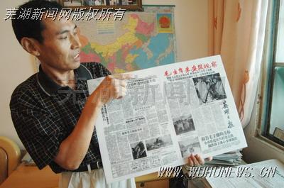 家住我市紅梅新村的“中國第一報迷”程正發(fā)近日向記者展示了自己創(chuàng)意并珍藏的國內(nèi)首張?zhí)沾蓤蠹垼ㄈ鐖D),以緬懷偉人毛主席。而這張報紙的內(nèi)容,記錄了毛主席50年前第一次到安徽蕪湖視察的相關(guān)情況。