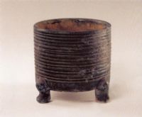 此奩仿漢代造型,圓筒腹,下承三足,器壁裹外施綠釉,外壁從口到底由等距弦紋作飾。整個器皿端莊雋秀。