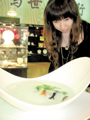 昨日,唐山國(guó)際會(huì)展中心展館展出了一個(gè)新奇的“魚(yú)缸”。據(jù)廠家介紹,這個(gè)造型別致的瓷器并非魚(yú)缸,而是為大型賓館、酒店設(shè)計(jì)生產(chǎn)的大沙拉盤(pán)。而將其作為魚(yú)缸則是他們?yōu)樵黾赢a(chǎn)品觀賞性的一個(gè)創(chuàng)意,使原本素面朝天的白色瓷盤(pán)有了生氣,也為整個(gè)陶瓷展區(qū)增添了一個(gè)小亮點(diǎn)。