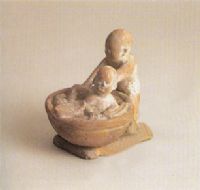 粉彩沐浴童俑出土于唐墓,紅色陶質(zhì),原施粉彩,年久脫落。在長方形的底座上置一鍪形盆,盆中一細(xì)童爬在水中,頭高高仰起,面露頑皮神態(tài)。盆外站一稍長童子為盆中幼童擦肩。兩童均祼體,體態(tài)豐滿,兒童的形態(tài)特點,洗澡的神態(tài)及盆中流動的水紋,均塑造得準(zhǔn)確、生動,惟妙惟肖。
