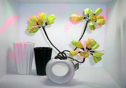 黃白,高矮的花瓶透露著和諧,婀娜的枝干開出朵朵芬芳,橙色的花瓣把純白的空間渲染得空曠而賦予感染。
