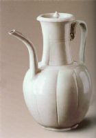 壺長頸,瓜棱形圓鼓腹,圈足,壺蓋小鈕平面,肩部前出細高彎流,柄仿金屬器扁帶式曲柄。